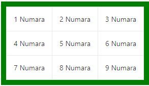 1 2 3 4 5 6 7 8 9 10 11 12 13 14 15 16 17 18 19 | <table style="border: 10px solid green;"> <!--Kalınlığı 10px ve rengi yeşil olarak ayarlıyoruz--> <tr> <td>1 Numara</td> <td>2 Numara</td> <td>3 Numara</td> </tr> <tr> <td>4 Numara</td> <td>5 Numara</td> <td>6 Numara</td> </tr> <tr> <td>7 Numara</td> <td>8 Numara</td> <td>9 Numara</td> </tr> </table> |